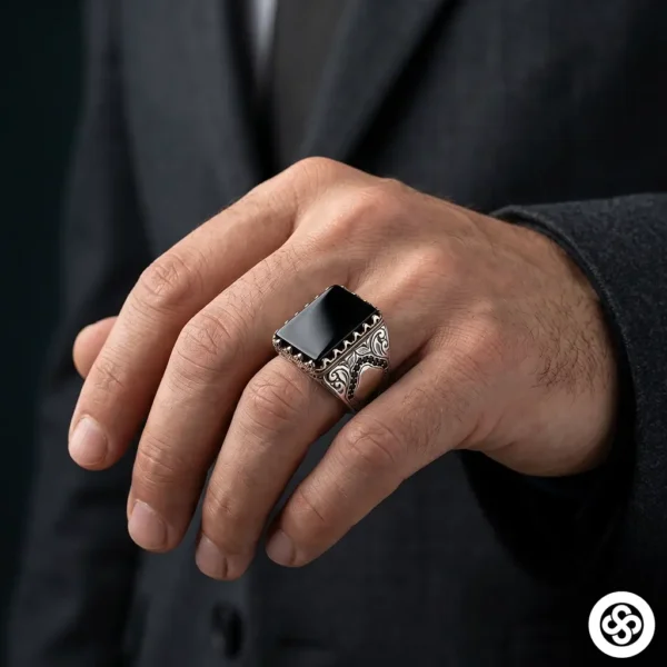 Kare Akik Taşlı 925 Ayar Siyah Taşlı Gümüş Erkek Yüzük