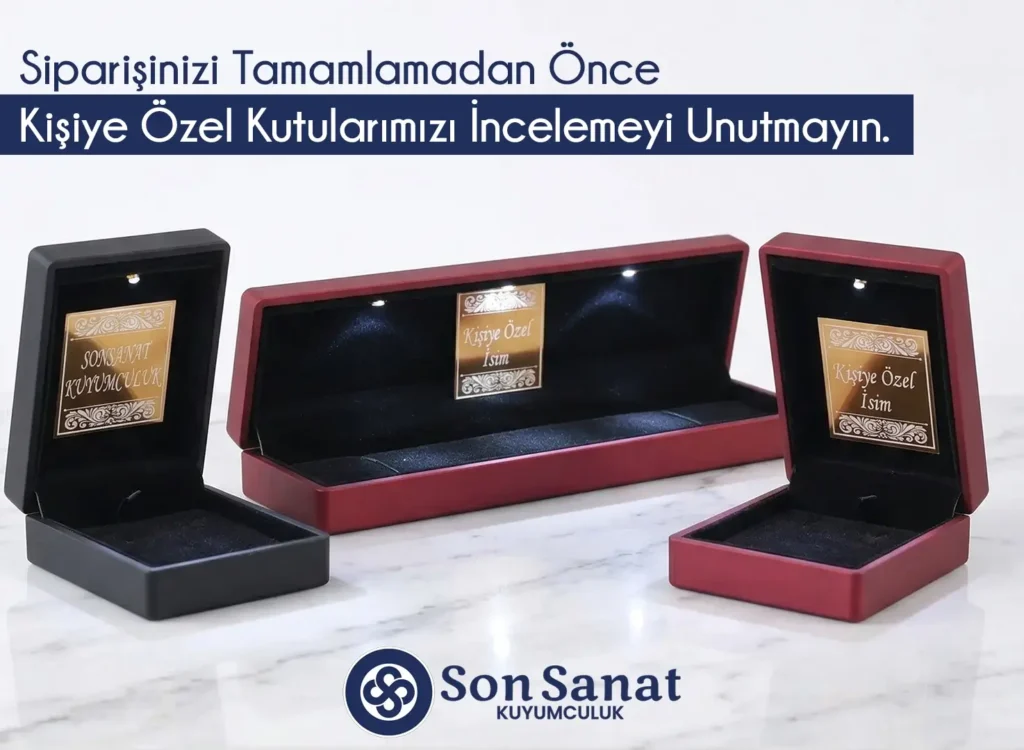 En değerli anlarınıza eşlik eden takılarınız, sıradan bir kutudan daha fazlasını hak ediyor. Son Sanat Kuyumculuk kalitesiyle sunulan kişiye özel ışıklı kutularımız; zarif kadife dokusu ve isme özel metal plakasıyla sunumunuza asalet katar. Siparişinizi tamamlamadan önce bu prestijli dokunuşu sepetinize eklemeyi unutmayın.