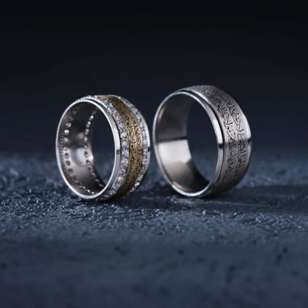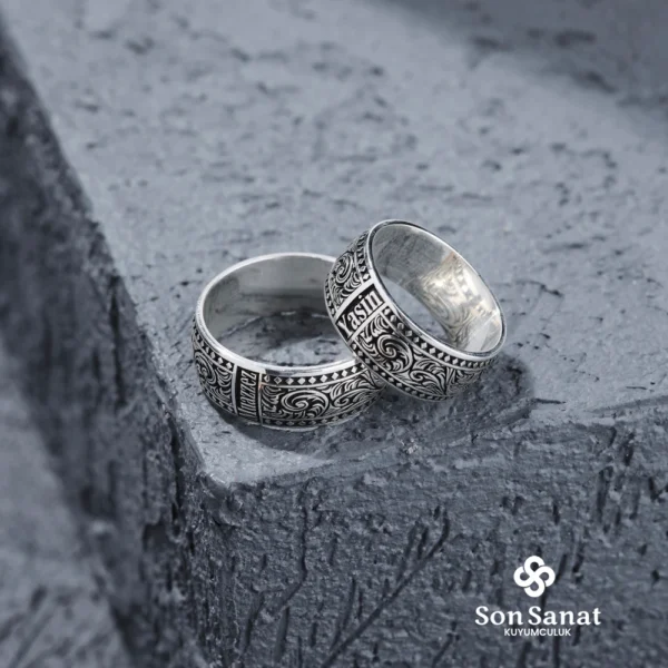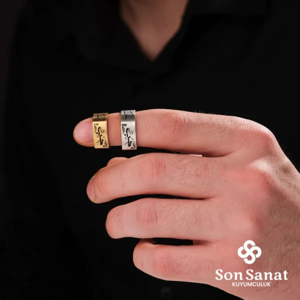 Gümüş Olarak Üretilmiştir. Kasın Yüzük Modeli Altın Kaplama Yapılmıştır. Ürünün Bir yüzünde Arapça Hat Sanatı İle (Kişi Sevdiği İle Beraberdir) Yazılmıştır. Diğer Tarafta İse Arapça Hat Sanatı İle (Kördüğüm Gibi Sevmek ) İşlenmiştir. Etrafında ise Osmanlı Motifleri İşlenmiştir.